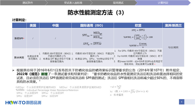 测试结果:假设一个防晒产品洗浴前的SPF值为45,洗浴后的SPF值为15(减少超过50%),则不得宣称其具有防水效果(中国)。