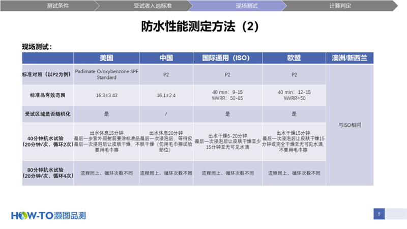 水池及水质:因原设备参数要求太过宽泛,对测试防水后的SPF值有极大影响,《规范》征求意见稿参考ISO,缩减了水温范围(28~32℃),并增加了流速要求(0.02~0.05 m/s),对于设备参数要求更加具体。其次,不同国家/地区对防水测试中的水质各有要求,如钙镁总和、pH值等。