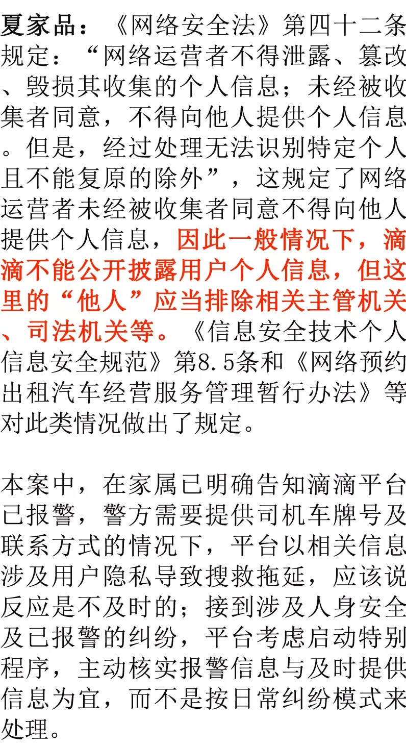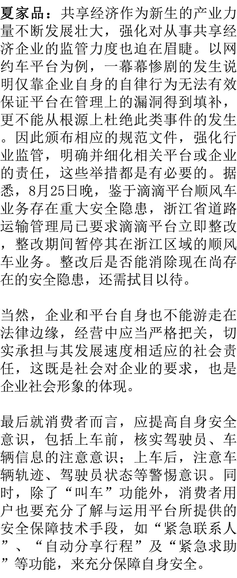 夏家品:虽然滴滴平台《顺风车信息平台用户协议》1.5条载明“顺风车平台提供的并不是出租、用车、驾驶或运输服务,我们提供的仅是注册用户之间的信息交互及匹配服务”,但这并不能排除平台对“顺风车”车辆及司机的资质信用所负的审核监管义务,尤其是监管义务。监管过程中,尤其收悉涉及人身安全方面的用户投诉后,滴滴平台应特别重视而启动应急程序,迅速查实并做出处理,以维护人身安全。