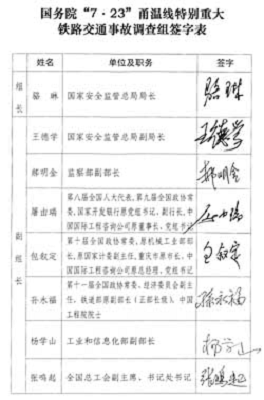 附件:国务院“7·23”甬温线特别重大铁路交通事故调查组签字表
