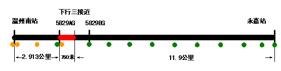 永嘉站至温州南站共 15.563公里 ,其中永嘉站至5829AG长 11.9公里 ,5829AG长 750米 ,5829AG至温州南站长 2.913公里 。