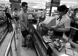 昨天上午,盲人陈欣带着他最新的家庭成员——导盲犬Betty,在家附近的舜世路等待公交车,可是,先后等来了五辆公交车,得到的答复都是“不能上车”。中午12点,陈欣和妻子付女士带着导盲犬Betty来到了恒隆广场。一位穿着保安制服的工作人员上前询问,得知是一位盲人带着导盲犬来卖场购物时工作人员说“既然是导盲犬就可以随便逛,有规定,导盲犬可以进入。”听保安这么说,陈欣和妻子心中多了一份温暖。
