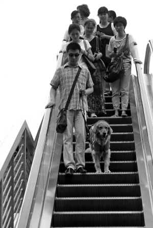 导盲犬就是主人的眼睛,走路,上下电梯、台阶都离不开它