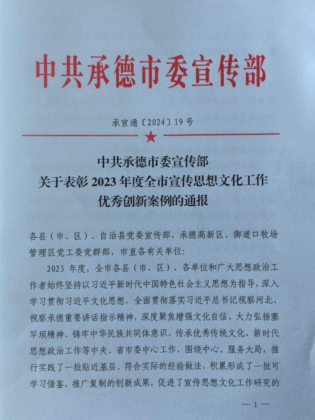 近日,中共承德市委宣传部印发了《关于表彰2023年度全市宣传思想文化工作优秀创新案例的通报》,其中市法院报送的创新案例《倾力打造“冀承未来”品牌 法治守护未成年人成长之路》被评为一等奖。
