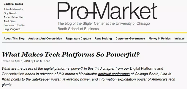 据华尔街见闻,芝加哥大学商学院the Stigler Center博客日前刊发文章《什么让科技平台如此强大?》,提到美国科技巨头的三种权力:守门人的权力,杠杆式放大的权力,以及信息挖掘的权力。
