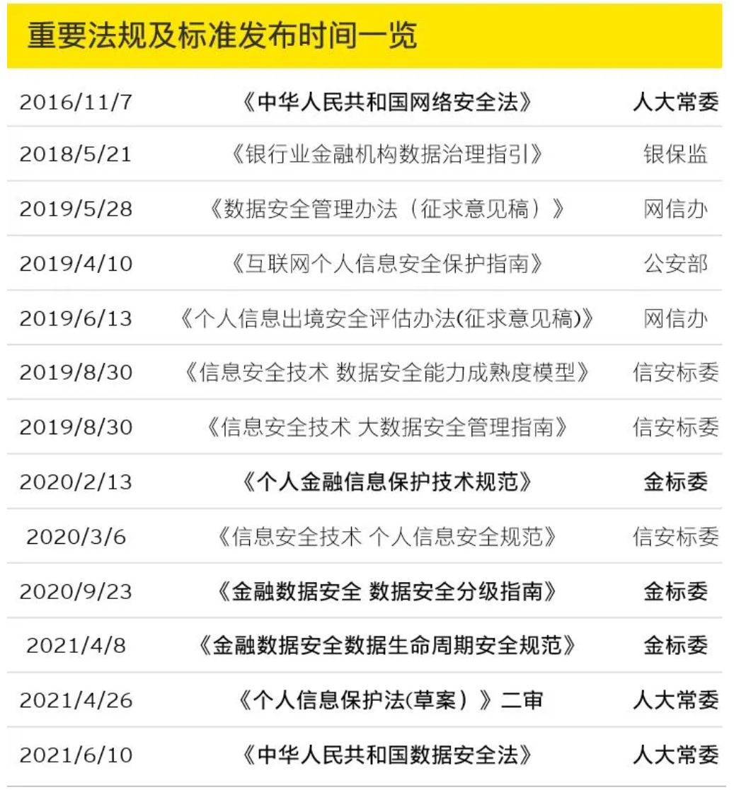 数据安全相关的法律、国家标准和行业标准的体系建立与完善,将指导金融机构建立企业内部数据安全体系,规范管控和技术标准,明确数据全生命周期安全要求,以解决数据安全治理、管理、技术、基础支撑各层次的历史难题。