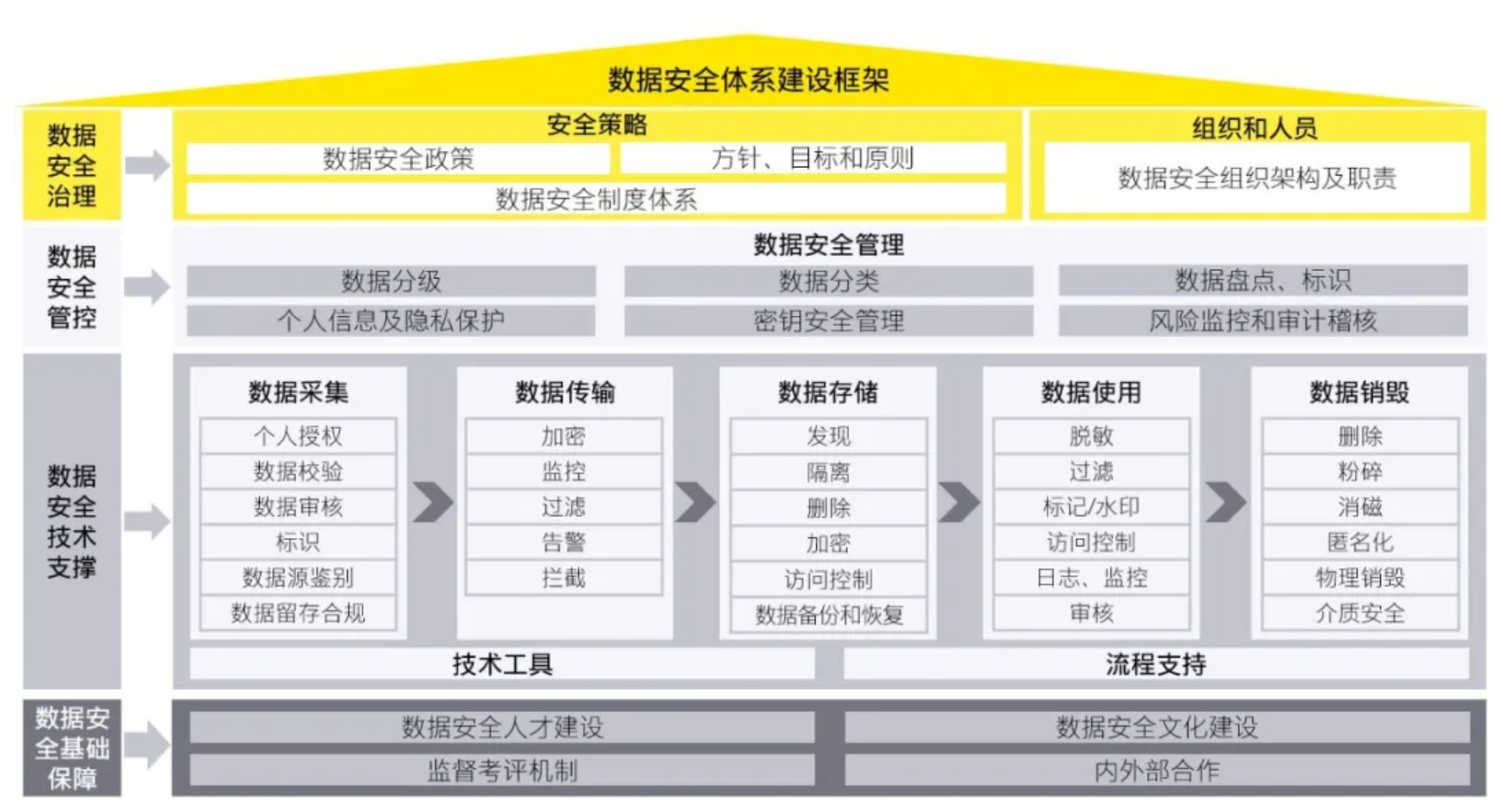 那么,如何针对不同受众,设计多场景、多层次的安全宣贯、培训及能力培养计划,开展既包括管理策略又涉及技术手段的数据安全培训,提升人员的素质能力和安全意识,当成为数据安全工作开展的重要支撑。安永认为可以通过如下分析框架来开展数据安全的体系建设。