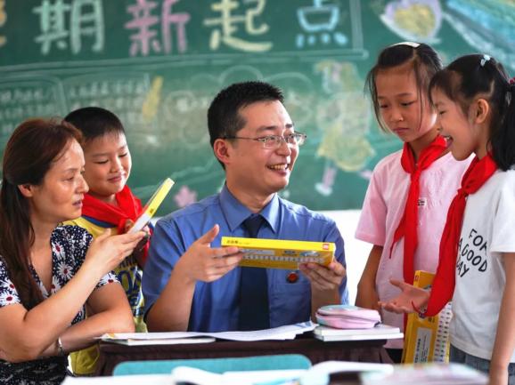 四川省绵竹市检察院检察官、石河村小学法治副校长宋振东为学生送上“开学第一课”。(资料图片)