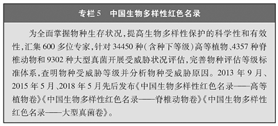 开展全国生物多样性调查与评估。大力推进生物多样性保护重大工程实施,结合自然资源调查、生态系统监测评估等工作,不断完善生物多样性调查与评估能力,首次将生物多样性指标纳入生态质量综合评价指标体系,引导地方加强生态文明建设与生物多样性保护。开展自然资源调查,包括森林、草原、水、湿地、荒漠、海洋等,建立自然资源调查评价监测制度。构建了涵盖2376个县级行政单元、样线总长超过3.4万公里的物种分布数据库,建立物种资源调查及收集信息平台,准确反映野生动植物空间分布状况。完成长江经济带、京津冀等国家战略区域180多个县级行政区生物多样性调查与评估。组织开展近海渔业资源调查,初步掌握近海渔业资源状况。陆续发布《中国植物红皮书》《中国濒危动物红皮书》《中国物种红色名录》《中国生物多样性红色名录》,基本掌握生物多样性总体情况,为加强生物多样性保护奠定了科学基础。