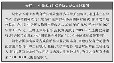 推动履约取得明显成效。中国为推动实现2020年全球生物多样性保护目标和联合国2030年可持续发展目标作出积极贡献。自发布《中国生物多样性保护战略与行动计划》(2011—2030年)以来,中国通过完善法律法规和体制机制、加强就地和迁地保护、推动公众参与、深化国际合作等政策措施,有力推动改善了生态环境。其中,设立陆地自然保护区、恢复和保障重要生态系统服务、增加生态系统的复原力和碳储量等3项目标超额完成,生物多样性主流化、可持续管理农林渔业、可持续生产和消费等13项目标取得良好进展。