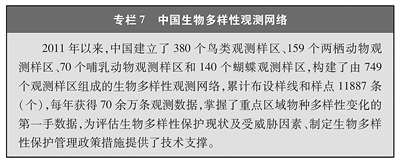 完善监测观测网络。中国建立起各类生态系统、物种的监测观测网络,在生物多样性理论研究、技术示范与推广以及物种与生境保护方面发挥了重要作用,为科研、教育、科普、生产等各领域提供了多样化的信息服务与决策支持。其中,中国生态系统研究网络(CERN)、国家陆地生态系统定位观测研究网络(CTERN)涵盖所有生态系统和要素,中国生物多样性监测与研究网络(Sino BON)覆盖动物、植物、微生物等多种生物类群,中国生物多样性观测网络(China BON)构建了覆盖全国的指示物种类群观测样区。