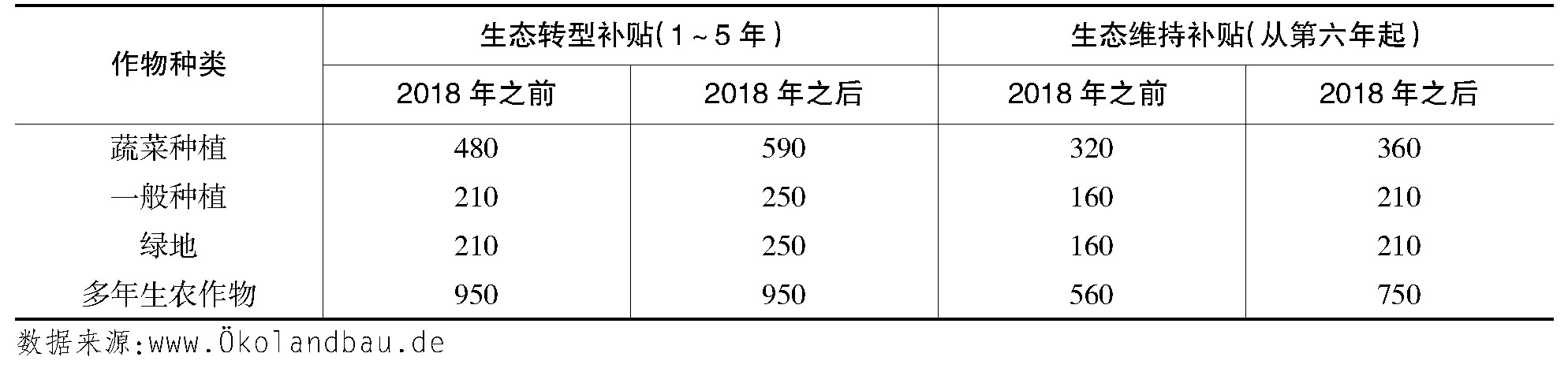 德国农业生态补偿方式主要分为三种:直接补贴、生态转型和维持补贴、休耕补贴。第一种直接补贴始于1992年,是对降低价格支持的补偿,包括常规和特殊补贴两类。2005年起,德国直接补贴逐步简化,农户和企业只要按照相关规定,以利于环境保护的方式从事农业生产便可以享受常规补贴[8]。补贴额度按照土地面积计算,补贴标准为每公顷300欧元。特殊补贴是在常规补贴基础上,对在农业生产中对环保作出特殊贡献的农民或企业给予的额外补贴:农业生产中遇到农地条件差、气候差等因素,或对动物和自然环境进行特殊保护等,均可获得特殊补贴。补贴的具体数额要根据实际的支出或损失进行折算。第二种是生态转型和维持补贴。这类补贴是德国进行农业生态补偿的最重要手段,德国政府主要通过这一补贴形式扩大农业生态经营面积。采用生态农业生产方式意味着农产品生产、加工成本大幅提高,导致向生态农业转型困难。转型后2耀3年内,由于销售价格偏高,生态农产品很难打开销路。与传统型农业农民相比,从事生态农业经营的农民收入水平大约低7%[9]。因此,德国政府为弥补农户从传统型经营向生态型经营转型而产生的收入损失,对已转型的农场给予转型补贴和维持补贴,以鼓励更多的传统型农场向生态农场转型,扩大生态经营面积,并为生态农场的正常运营提供支持。德国联邦政府和各州在国家战略计划中制定了2018—2021德国农村发展的总体框架,确定了农业生态的促进政策。由表1可见,此次计划提高了农业生态补贴的额度,其中维持经营补贴提升幅度较大。各联邦州可视各其生态农业发展的具体情况,申请国家生态补贴标准上调20%或下调30%。因此,在具体执行中,各州的生态补偿标准都不尽相同。第三种是休耕补贴。全国10%耀33%的土地实行休耕补贴制度,休耕土地每公顷补贴金额为200耀450欧元[10]。