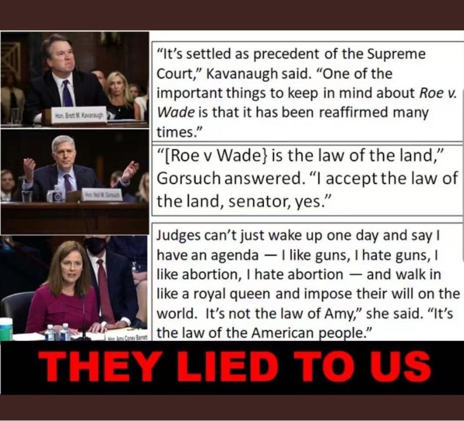 一幅政治宣传画,底部大字为:他们欺骗了我们。上方分别为被川普提名的三个大法官和他们在听证会上对不推翻罗伊案做出的保证。