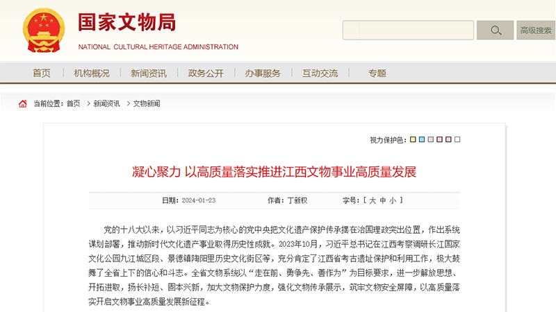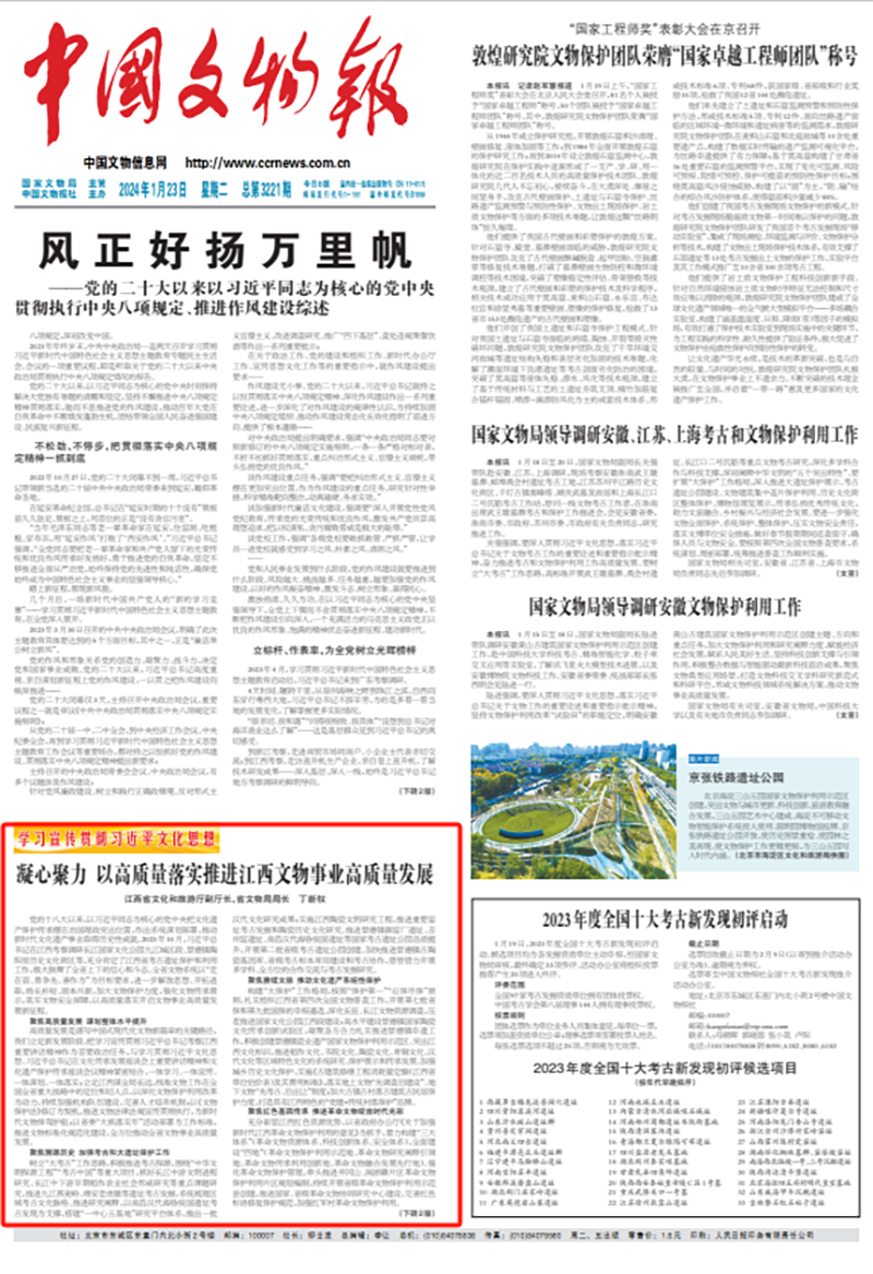 党的十八大以来,以习近平同志为核心的党中央把文化遗产保护传承摆在治国理政突出位置,作出系统谋划部署,推动新时代文化遗产事业取得历史性成就。2023年10月,习近平总书记在江西考察调研长江国家文化公园九江城区段、景德镇陶阳里历史文化街区等,充分肯定了江西省考古遗址保护和利用工作,极大鼓舞了全省上下的信心和斗志。全省文物系统以“走在前、勇争先、善作为”为目标要求,进一步解放思想、开拓进取,扬长补短、固本兴新,加大文物保护力度,强化文物传承展示,筑牢文物安全屏障,以高质量落实开启文物事业高质量发展新征程。