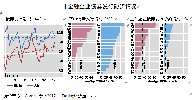 EMEs非金融企业债券发行期限明显提高(2017年约为9年),与AEs的差距缩小。EMEs企业发行的本币债券占比整体低于AEs;中国企业发行的本币债券占比较高(超过80%),与美国等发达经济体水平相当,同时中国国有企业债券发行余额占比高于其他经济体。