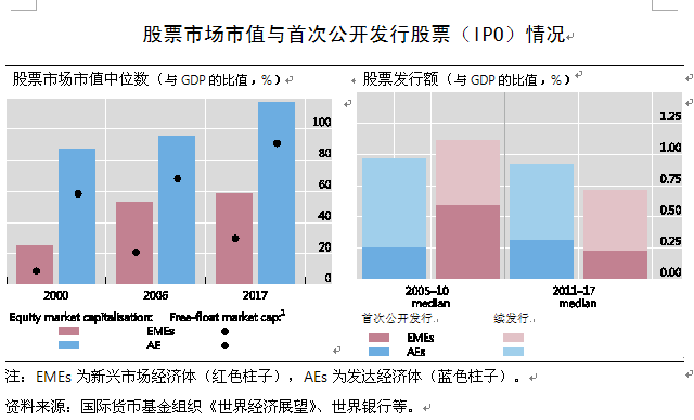 分市场看:各经济体股票市场规模一般仍大于债券市场规模,2000~2017年AEs和EMEs之间的股票市场规模差距缩小,但EMEs股票发行额和IPO规模(与GDP的比值)均呈现下降趋势。过去二十年债券市场规模快速增长且接近于股票市场规模;国际金融危机以来AEs政府债券发行规模增长较快,但多数AEs的企业债券市场规模仍大于政府债券市场;过去二十年EMEs的非金融企业债券和政府债券余额均增长较快,目前其政府债券市场规模接近于企业债券市场规模。