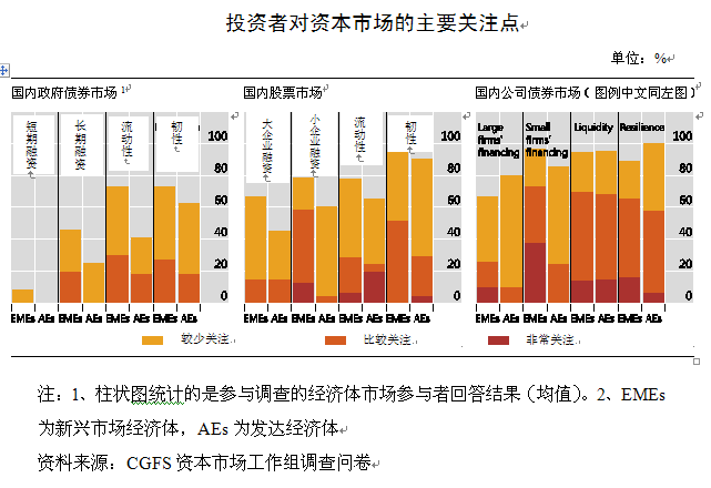 资本市场工作组调查问卷(下称“调查问卷”)结果显示,市场参与者对于不同市场功能的关注度从高到低依次为公司债券市场、股票市场和政府债券市场。在市场融资可获得性方面,市场参与者尤其是EMEs的市场参与者对中小企业融资最为关注。投资者对资本市场流动性和韧性(稳健性)的关注度要高于其对大企业融资情况的关注度。