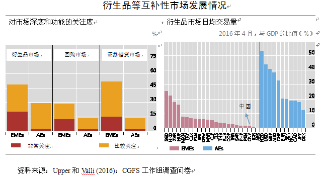 衍生品、回购、证券借贷等补充市场通过提供风险对冲和资金头寸工具,能够为资本市场提供支持,但这些市场的发展也有明显异质性,即使拥有相对发达衍生品市场的EMEs,其市场规模也低于大多数AEs。调查显示,EMEs的市场参与者对衍生品等互补性市场的关注度相对更高,但数据显示EMEs衍生品市场日均交易规模明显低于AEs。