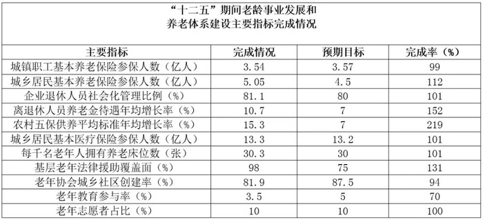 “十二五”时期我国老龄事业和养老体系建设取得长足发展。《中国老龄事业发展“十二五”规划》、《社会养老服务体系建设规划(2011—2015年)》确定的目标任务基本完成。老年人权益保障和养老服务业发展等方面的法规政策不断完善;基本养老、基本医疗保障覆盖面不断扩大,保障水平逐年提高;以居家为基础、社区为依托、机构为补充、医养相结合的养老服务体系初步形成,养老床位数量达到672.7万张;老年宜居环境建设持续推进,老年人社会参与条件继续优化;老年文化、体育、教育事业快速发展,老年人精神文化生活日益丰富;老年人优待项目更加丰富、范围大幅拓宽,敬老养老助老社会氛围日益浓厚,老年人的获得感和幸福感明显增强。