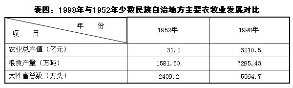 中华人民共和国成立后,从中央到地方的各级政府积极领导少数民族农牧民开展农田基本建设和草原基本建设,采取各种措施发展农村经济,提高农业生产水平。政府通过无偿发放农具、发放生产资金、减免农牧业税、发放无息或低息贷款等措施,扶持少数民族地区农村经济的发展,取得了显著成就(见表四)。1998年,少数民族自治地方农民人均纯收入达1633.11元,是1980年的21.5倍。