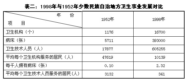——民族自治地方的自治机关自主地决定本地区的医疗卫生事业发展规划,发展现代医药和民族传统医药,加强地方病防治和妇幼卫生保健,改善卫生条件,使少数民族的健康水平得到提高(见表二)。