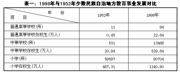 ——民族自治地方的自治机关根据国家的教育方针,依照法律,决定本地方的教育规划,各级各类学校的设置、学制、办学形式、教学内容、教学用语和招生办法,自主地发展民族教育(见表一)。1949年以前,宁夏全区文盲率高达95%以上,没有高等教育;现在一个结构合理、各类教育事业互为补充、多层次办学协调发展的教育体系已经形成。截至1998年,宁夏全区有各级各类学校6100多所,在校生达130多万人,其中普通高等学校5所,在校生有1.1万多人,全区非文盲率达到89.5%。旧西藏没有一所现代意义的学校,文盲率高达95%;到1998年,全区已拥有各级各类学校4365所,适龄儿童入学率达到81.3%,文盲率减少了47个百分点。