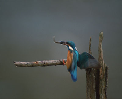 翠鸟一直给人古灵精怪的印象,之前见到它都是在眼前闪过,或者只闻其声不见其鸟。翠鸟捕鱼时紧盯水面,一旦发现鱼鳞银光一闪,它便立即紧夹双翼,尾上头下,全身子弹般笔直插入水中,双喙像镊子一样张开,钳住猎物。随后,张开双翼,掉头振翅冲出水面,衔着猎物飞回原处享用,整个过程不过几秒钟。由于翠鸟冲入水中捕鱼的动作过快,因此不明究理的古人将翠鸟捕鱼的行为错误地理解为翠鸟特别爱惜其羽毛,所以每日都下水洗濯翠羽。