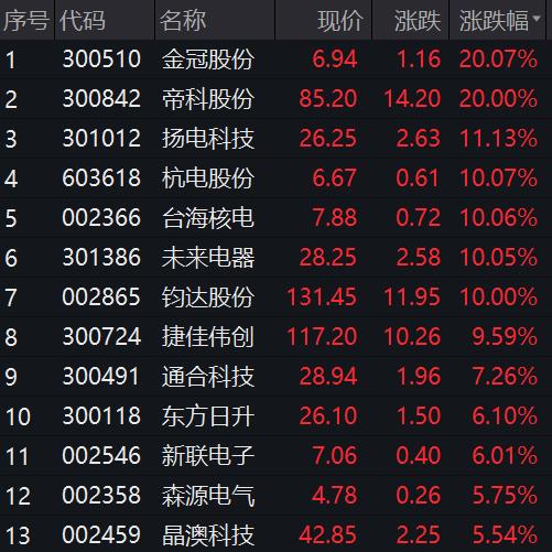 个股方面,帝科股份上午成功实现20CM涨停,宁波能源、桂东电力、钧达股份等涨停,捷佳伟创涨近10%。