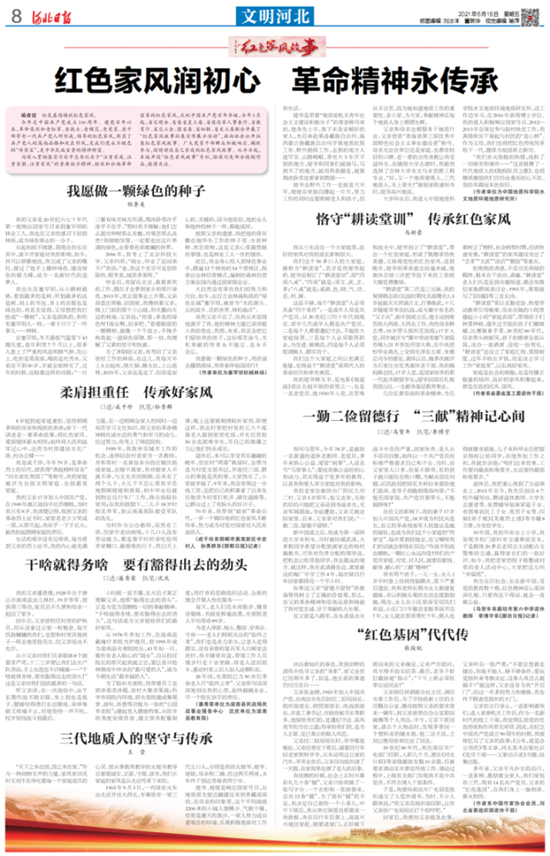 开设“红色家风故事”专栏,推出《我愿做一颗绿色的种子》等50余篇报道,传承弘扬红色家风,展示共产党人的高尚品格和优良作风。在《文明河北》专版,推出《“一盔一带”记心间 文明安全在身边》等200余篇报道,大力倡导社会文明新风尚,助力培育和践行社会主义核心价值观。