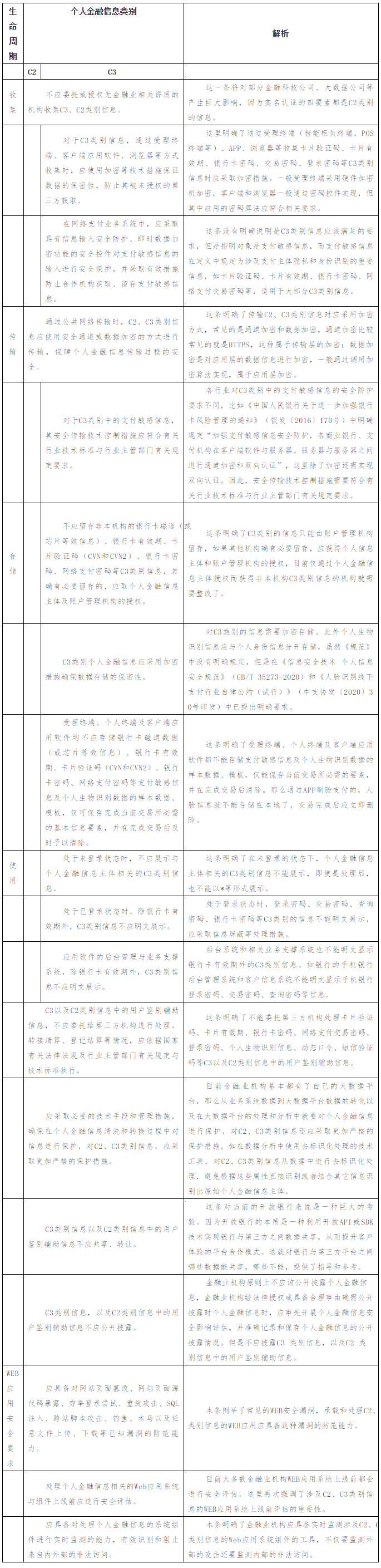 个人金融信息的分类不仅对个人金融信息控制者提出了不同类别的个人金融信息应实施不同的安全防护策略,而且对金融业机构的数据分类分级提供了指导和参考。下面笔者梳理了《规范》对C2、C3类别的个人金融信息在收集、传输、存储、使用等生命周期及安全运行等各环节的重点安全防护要求。