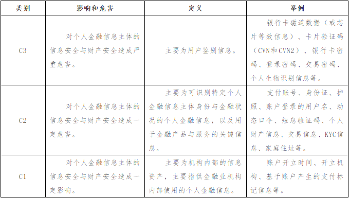 《规范》根据信息遭到未经授权的查看或未经授权的变更后所产生的影响和危害,将个人金融信息按敏感程度从高到低分为C3、C2、C1三个类别,具体如下。