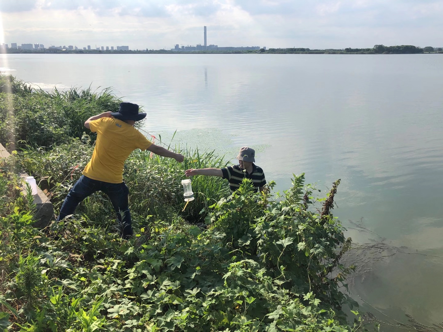 2020年冯育青与湿地站工作人员在长三角生态绿色一体化发展示范区汾湖进行调研,右为冯育青,左为范竞成。