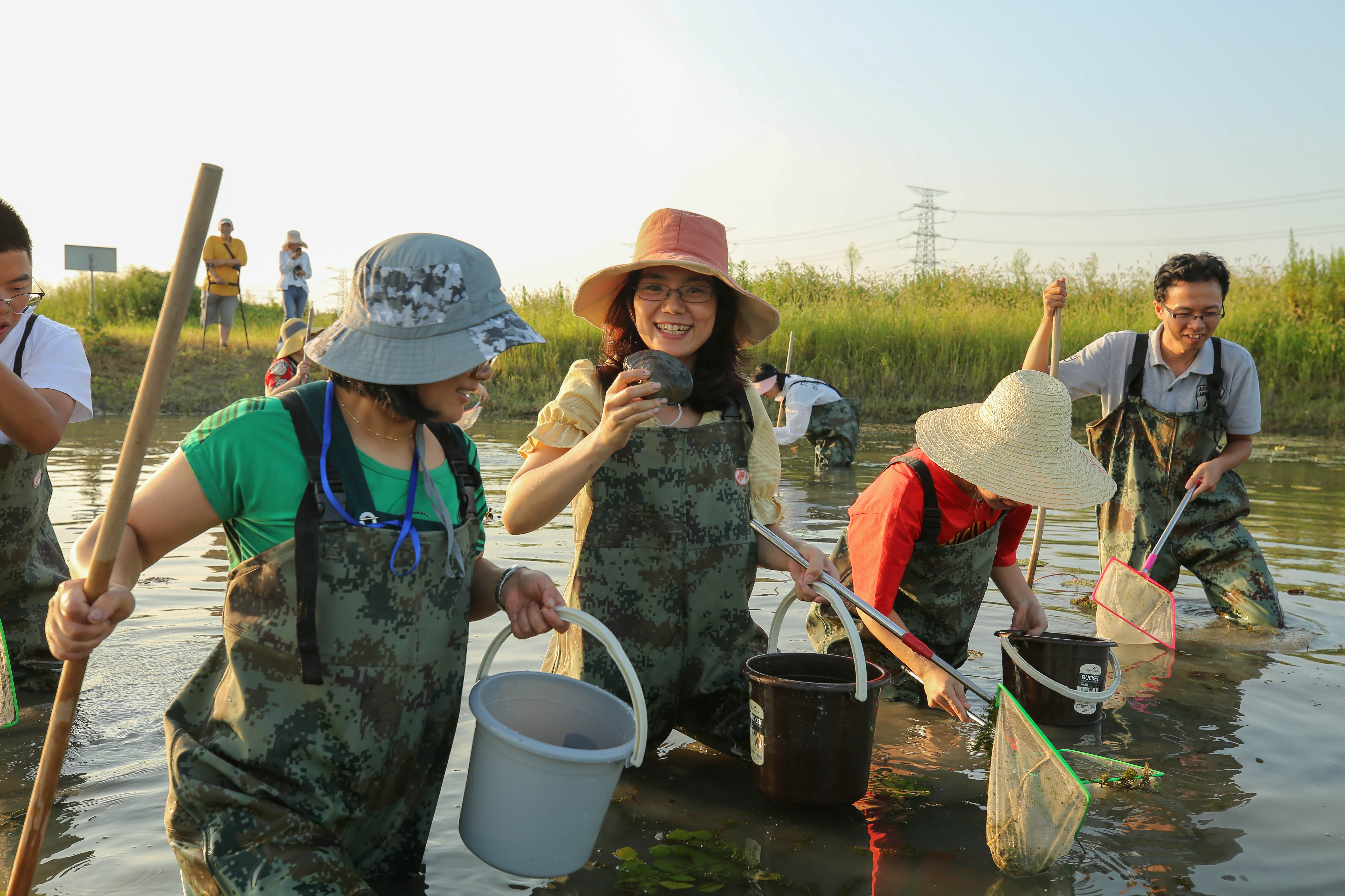 在昆山天福国家湿地公园组织的公民科学家活动中,湿地公园的管理人员穿青蛙装下水。