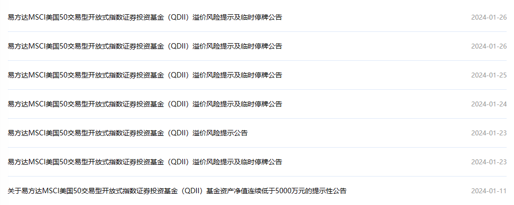 1月26日晚,上交所公告称,本周对易方达MSCI美国50ETF等溢价较高的基金进行重点监控。