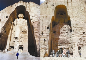 ▲巴米扬大佛包括两座公元6世纪左右建成的佛像,2001年3月被当时控制阿富汗的塔利班武装炸毁。左图为巴米扬大佛被毁前,右图为一些塔利班武装人员站在被彻底摧毁的巴米扬大佛前。新华社 发