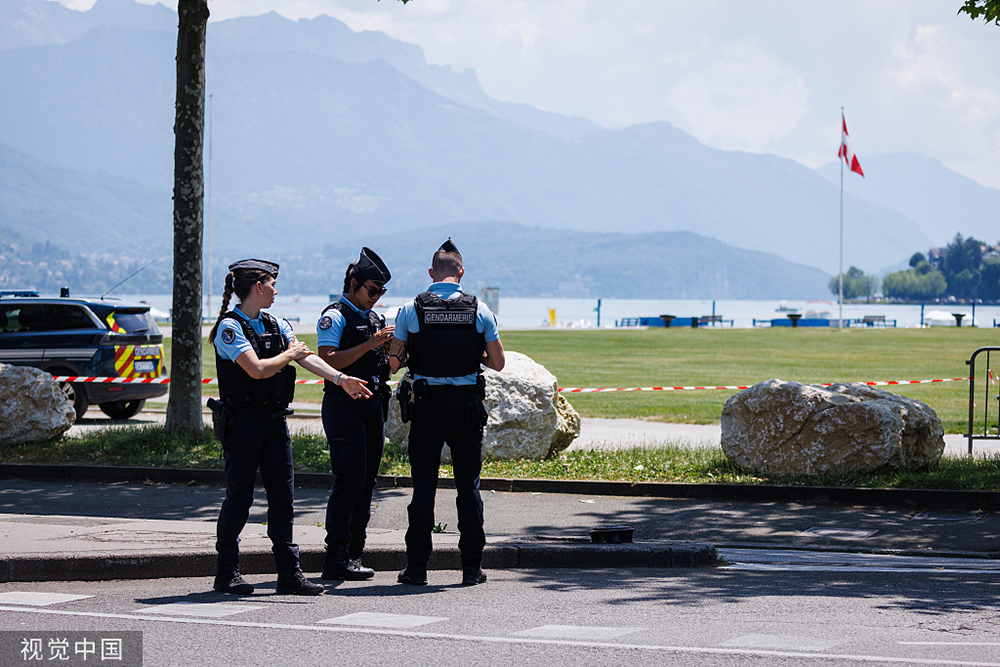 当地时间2023年6月8日,法国上萨瓦省阿纳西地区,一名男子在公园附近刺伤多人,执法人员站岗执勤。