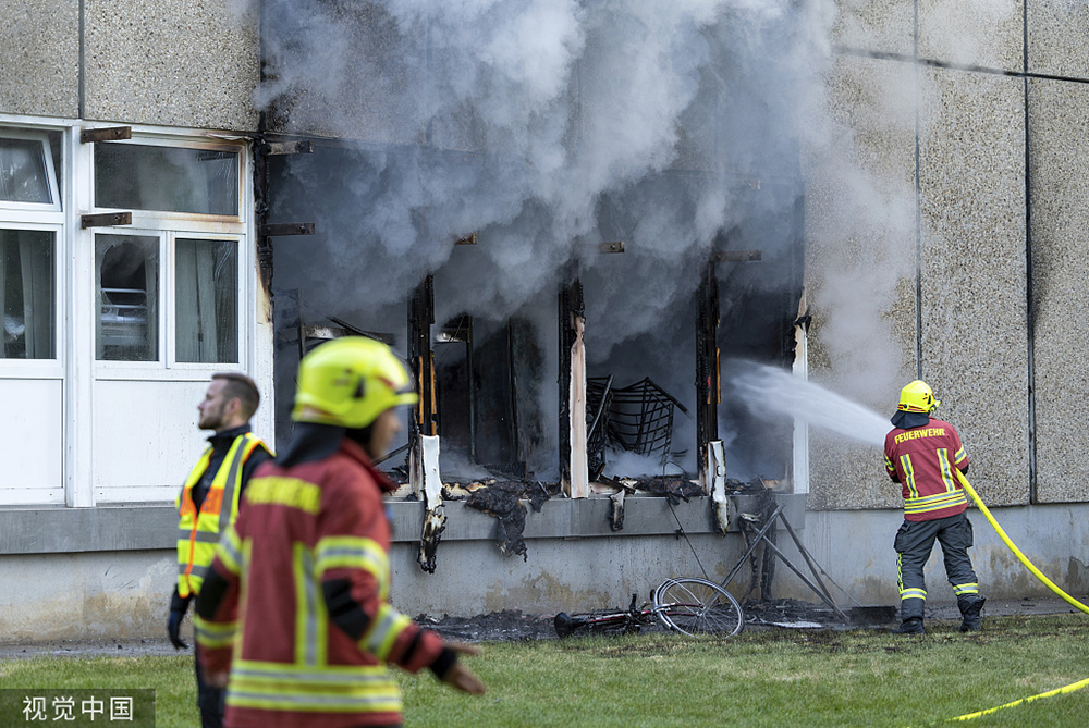 当地时间2023年6月4日,德国阿波尔达,消防员正在扑灭难民收容所的大火。火灾后发现了一具尸体。