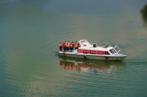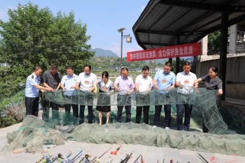 签约结束后,协作单位领导及工作人员共同前往黔江区濯水镇阿蓬江岸边集中销毁禁用渔具,登船联合巡河护渔。