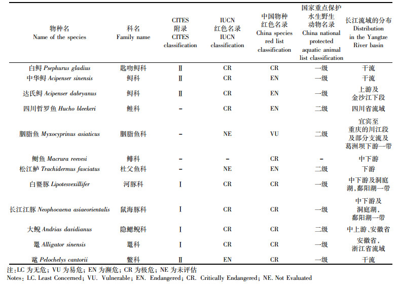 以《IUCN红色名录》、《中国物种红色名录》、《国家重点保护水生野生动物名录》、《CITES》的划分标准对长江流域濒危水生野生动物部分代表物种进行整理,见。
