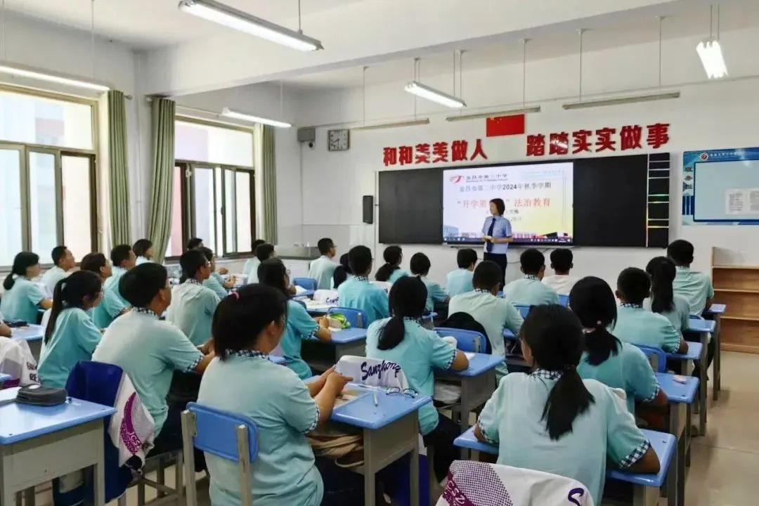 8月26日,金昌市司法局法治副校长走进市第三中学,以“新媒体直播”形式为全校师生送上开学季的“法治第一课”。课上,法治副校长以“法律是什么?”为切入点,从“未成年人学法的意义”“如何用法律保护自己”“预防未成年人犯罪”三个方面引导学生,明确法律的由来和内涵,明白法律的规则和底线,明晰法律的学习和运用。鼓励学生树立法治思维,教育学生心有所畏、矩有所守、行有所止,号召学生以自身为辐射点,将所学到的法律知识传播给身边的人。课后,法治副校长走进班级教室,以问答方式与学生“面对面”交流,现场气氛热烈。
