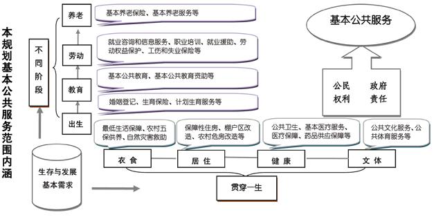 根据“十二五”规划纲要,为突出体现“学有所教、劳有所得、病有所医、老有所养、住有所居”的要求,本规划的范围确定为公共教育、劳动就业服务、社会保障、基本社会服务、医疗卫生、人口计生、住房保障、公共文化等领域的基本公共服务。