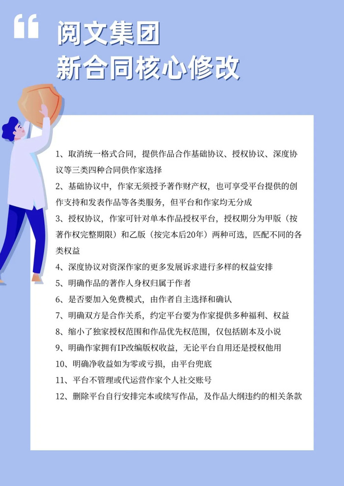 6月3日,阅文集团新管理层发布了针对旗下作者的“单本可选新合同”。阅文方面表示,该合同根据不同授权分为三类四种,取消单一格式合同,并对此前充满争议的旧合同进行了十余项修改,以长图的形式为网友们划出重点。
