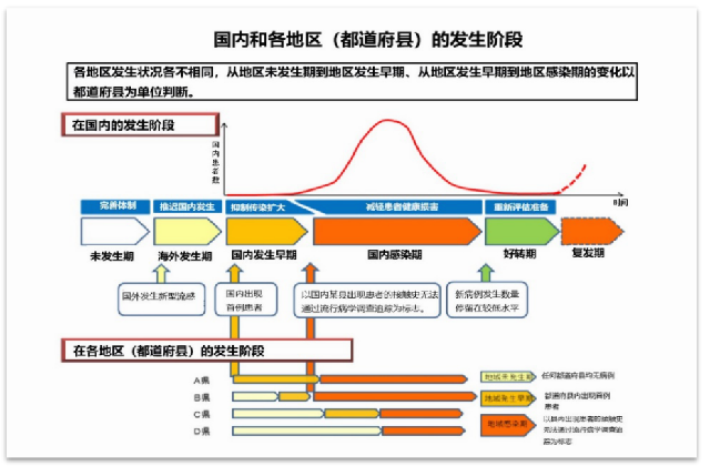 具体制定对策时,日本厚生劳动省将流感等传染病的发生阶段分为未发生期、海外发生期、国内发生早期、国内感染期、好转期五个阶段,根据不同阶段采取不同应对措施,同时根据各地区情况,由地方自治体和公共团体灵活应对。
