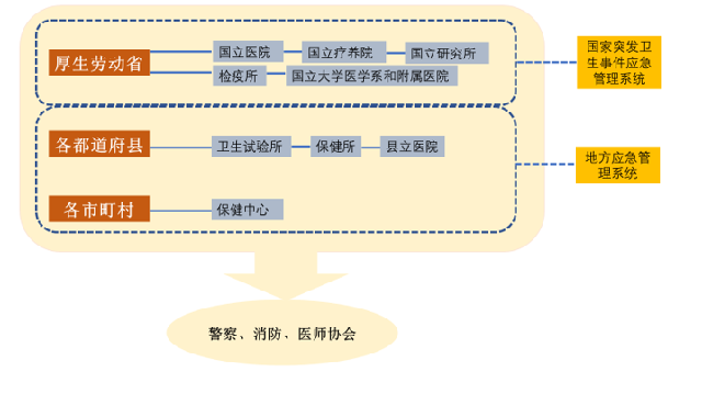从国家层级来看,检疫所、国立大学医学系和附属医院、国立医院、国立疗养所、国立研究所,构成独立的国家突发公共卫生事件应急管理系统;从地方层级来看,都道府县(东京都、北海道、大阪府和京都府、43个县,其行政级别类似我国的省级)的卫生健康局、卫生试验所、保健所、县立医院,以及市村町(类似于我国的县级)的保健中心组成地方管理系统。