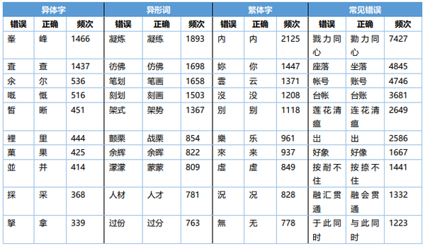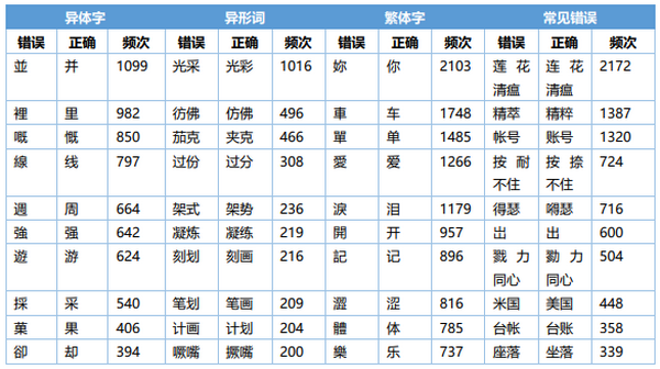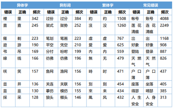 统计不同来源内容中四类不规范字词的TOP10。在互动论坛,因字音字形相近导致的常见错误和繁体字误用问题较为突出,如帐(账)号、岀(出)、沒(没)等字词在字号小、书写及阅读速度快时容易混淆。