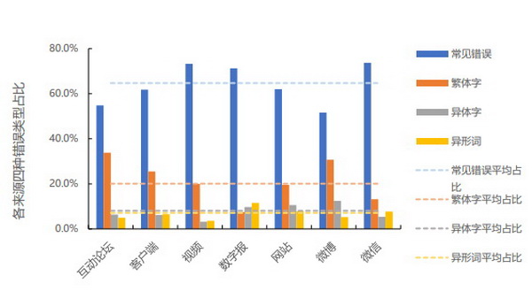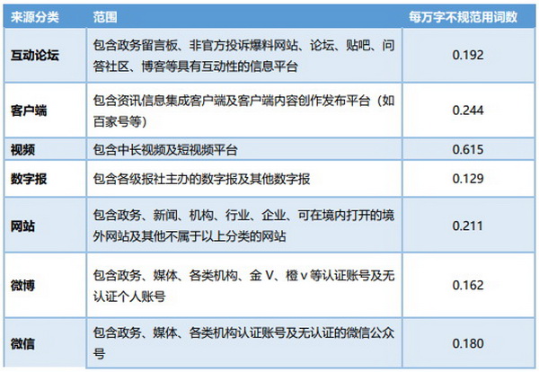 各来源出现不规范字词的万字错误率平均为0.192/10000。对比不同来源出现频率,数字报错误率最低,仅为0.129/10000,延续媒体对内容严谨性的要求。视频平台错误率最高,达到0.615/10000。微博平台错误率低于平均,因内容篇幅短,且内容风格更加生活化,相较其他平台产生错别字的概率较低。客户端、网站、微信公众号信息发布者来源广,属于互联网时代流量较大的信息发布渠道,但微信在公众平台内容发布时已经引入疑似错别字的自动判断功能,对提升用词规范性、避免常见错误有所帮助,因此微信平台不规范字词出现频率低于客户端和网站。