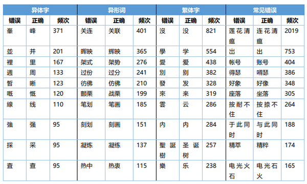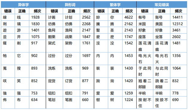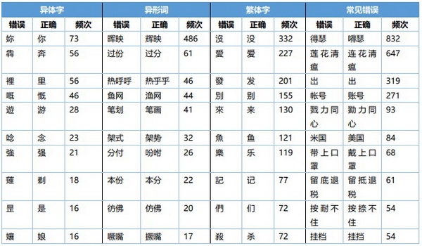 常见错误是互联网上主要出现的不规范用字(词)形式,在TOP20高频不规范词中占9项。常见错误中帐(账)号、莲(连)花清瘟等属于误用形近别字,颤(战)栗、架式(势)等属于误用读音相近的字。另外,互联网上还存在为表达其他含意故意使用不规范字的情况,如“米(美)国”来源于网友模仿日本对美国的称呼,该类特殊用法目前在网络平台上已具有一定流传度。