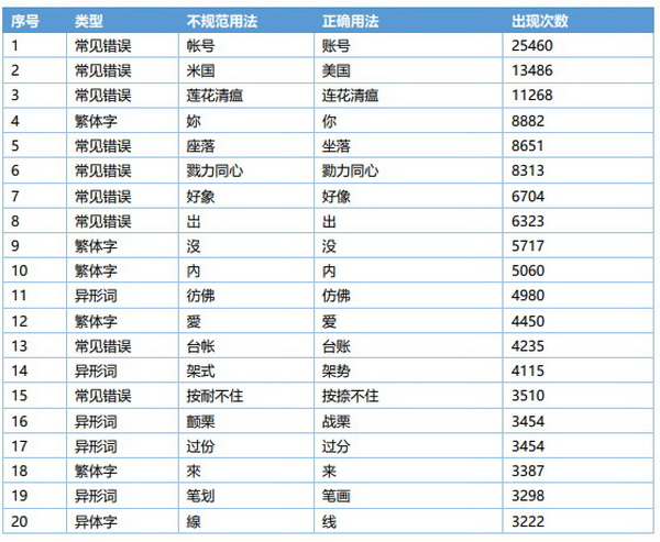 根据数据库信息,按照不规范字(词)出现频次,整理互联网平台出错较多的错别字,并在括号中标注正确写法,易错前20名分别依次是:帐(账)号、米(美)国、莲(连)花清瘟、妳(你)、座(坐)落、戮(勠)力同心、好象(像)、岀(出)、沒(没)、內(内)、彷(仿)佛、愛(爱)、台帐(账)、架式(势)、按耐(捺)不住、颤(战)栗、过份(分)、來(来)、笔划(画)、線(线)。