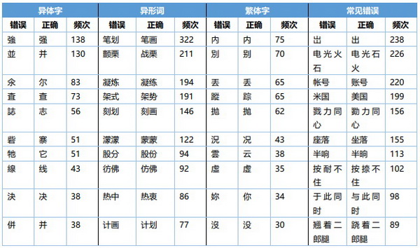 异形词、繁体字各有5项出现。异形词因音、义均相同,曾经都被广泛使用,虽然经《异形词整理表》确定规范用法,但因宣传不足,公众依然延续旧有的使用习惯,具有易错性。TOP20中繁体字中岀(出)、沒(没)等与正确用字的字形非常相近,在快速输入或手机等小屏幕输入场景中易混淆;妳(你)、愛(爱)等属于近年来互联网上常见用法,被部分网友故意用于表达个性,因此出现频率较高。