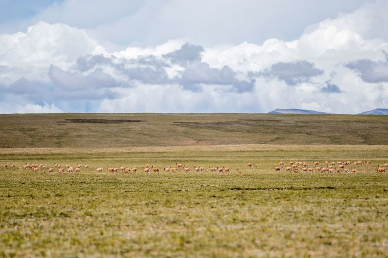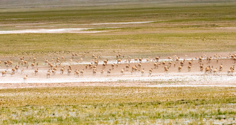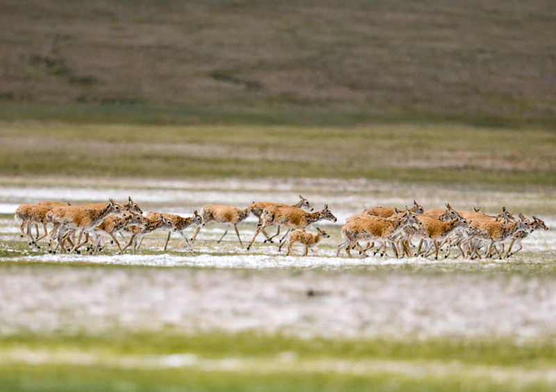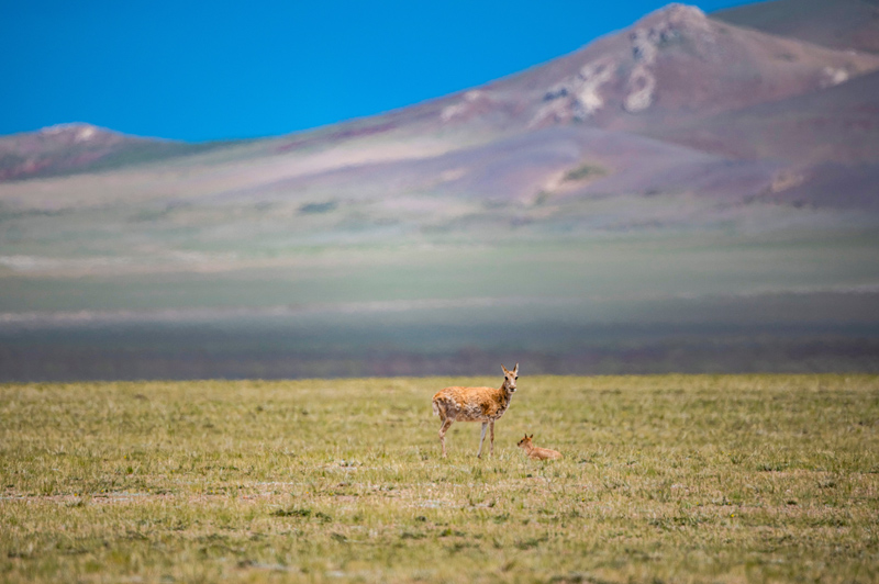每年夏季是藏羚羊的产崽季。期间,母藏羚羊会在公羊的护送下,从四面八方奔赴羌塘草原深处。在整个产崽育幼期间,都有公藏羚羊在外围严密警戒。返回途中,数千只藏羚羊集体出行,浩浩荡荡、场面壮观。